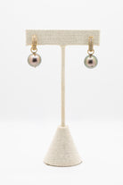 These earrings feature lustrous Tahitian pearls from diamond encrusted gold hoops. The pearls display rich, natural hues with sublet iridescence, perfectly complemented by sparkle of pave set diamonds.