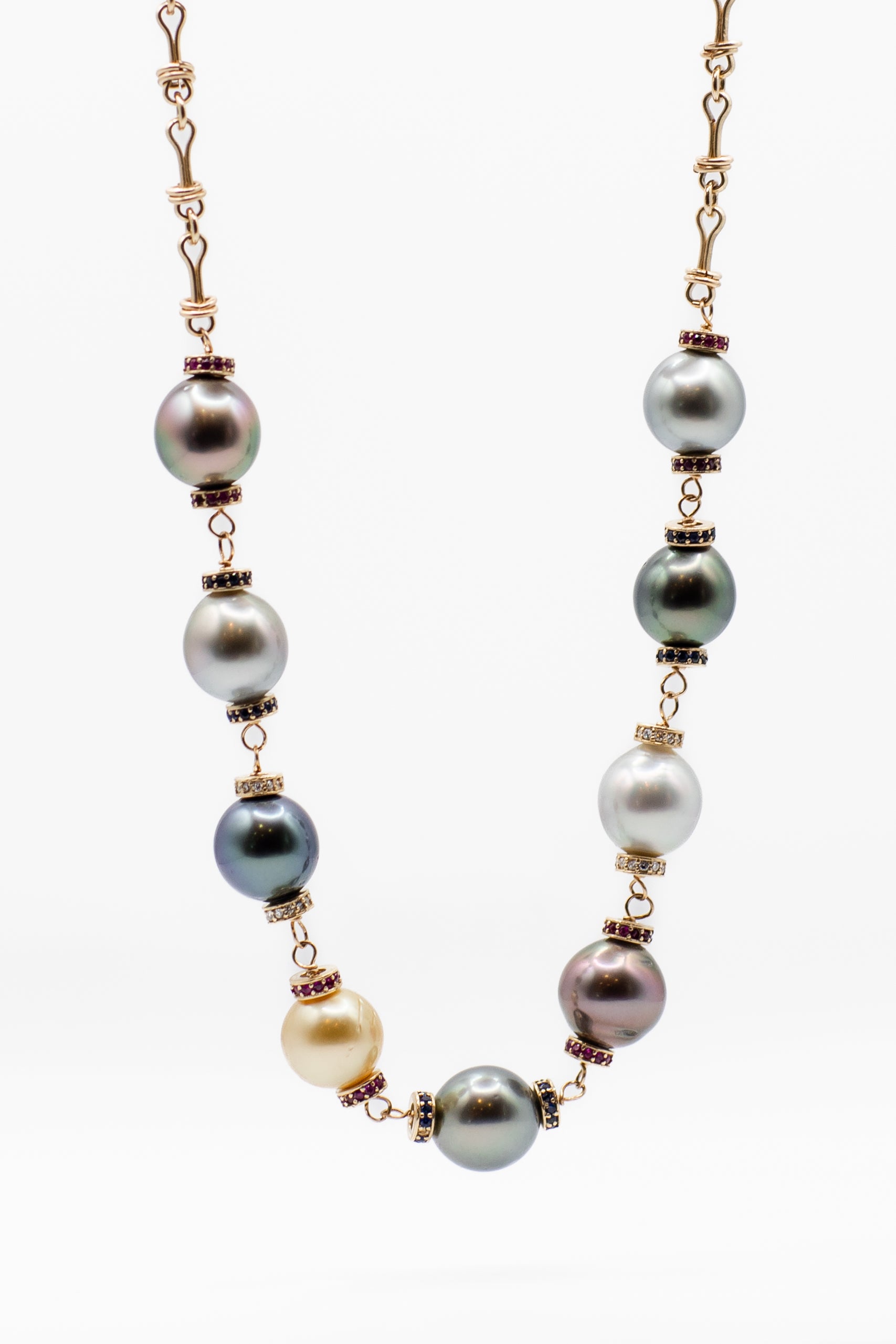 Black Pearl Necklace with Ruby Sapphire and Diamond Spacers