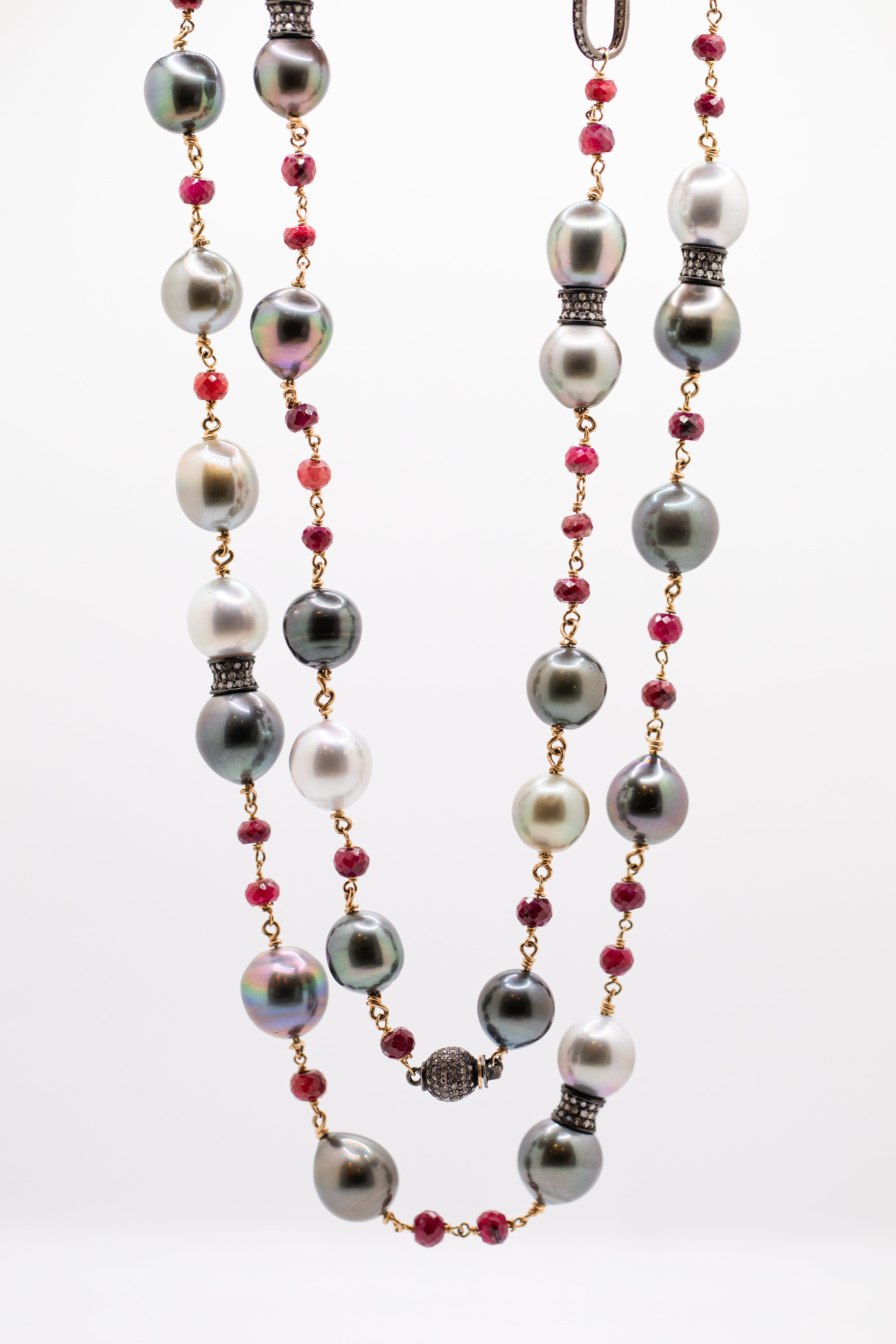 This necklace combines pearls with vivid red rubies, creating a playful yet refined balance of color and shine. Its elongated strange offers versatility, whether worn as a statement layer or draped simply for everyday elegance.