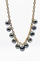 Elevate your style with this striking Tahitian Pearl Necklace. Featuring luminous, hand selected Tahitian Pearls suspended from a bold 18k gold chain, this necklace blends timeless elegance with modern edge. Each pearl displays the natural iridescence Tahitian pearls are celebrated for-shades of silvery gray, deep charcoal, and subtle peacock overtones- making every piece unique.