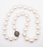 This classic pearl necklace features luminous white pearls, hand-strung for a timeless and elegant look. Finished with a textured round clasp, it offers both sophistication and secure wear, making it a versatile piece for any occasion.