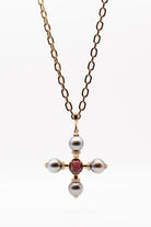 This striking pendant shows a bold cross design, crafted with Tahitian Pearls set at each point. Known for their natural depth of color, the pearls bring a sense of grace and rarity to the piece. At the heart of the pendant rests a tourmaline cabochon, its soft red hue offering a captivating contrast to silverly pearls.