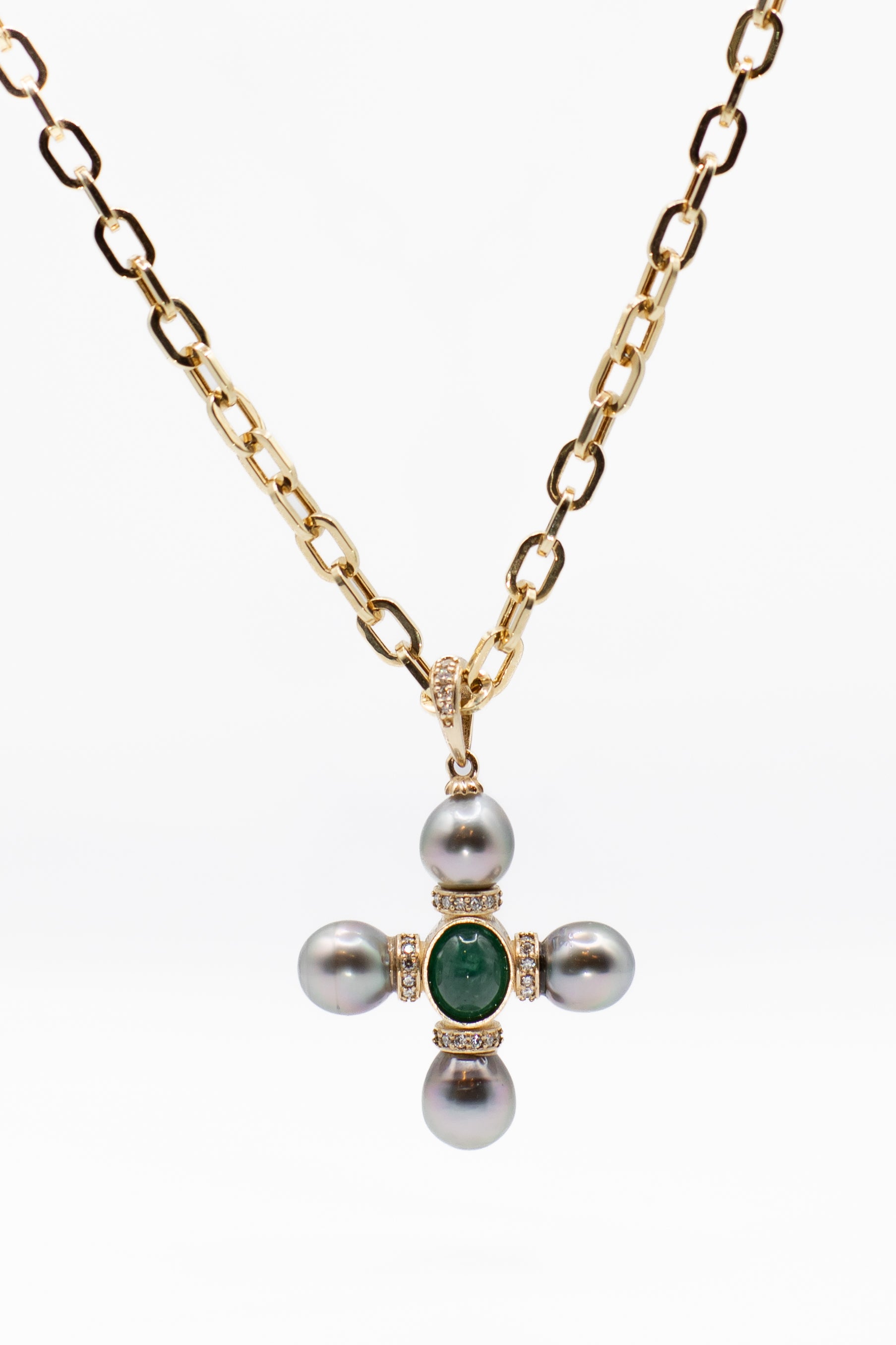 This striking pendant shows a bold cross design, crafted with Tahitian Pearls set at each point. Known for their natural depth of color, the pearls bring a sense of grace and rarity to the piece. At the heart of the pendant rests a vivid emerald cabochon, its rich green hue offering a captivating contrast to silverly pearls.